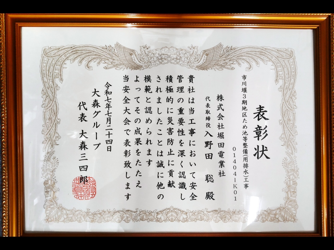 | 6月6日 | 日建工業株式会社 令和7年安全表彰 【表彰】 日建工業株式会社 代表取締役社長 大泉 敏様より 国土交通省発注 若林地区道路改良舗装工事の照明設備分野で安全表彰を受けました。 従業員一同さらに安全施工で行きたいと思っております。 皆様のさらなるご指導宜しくお願い致します。 |